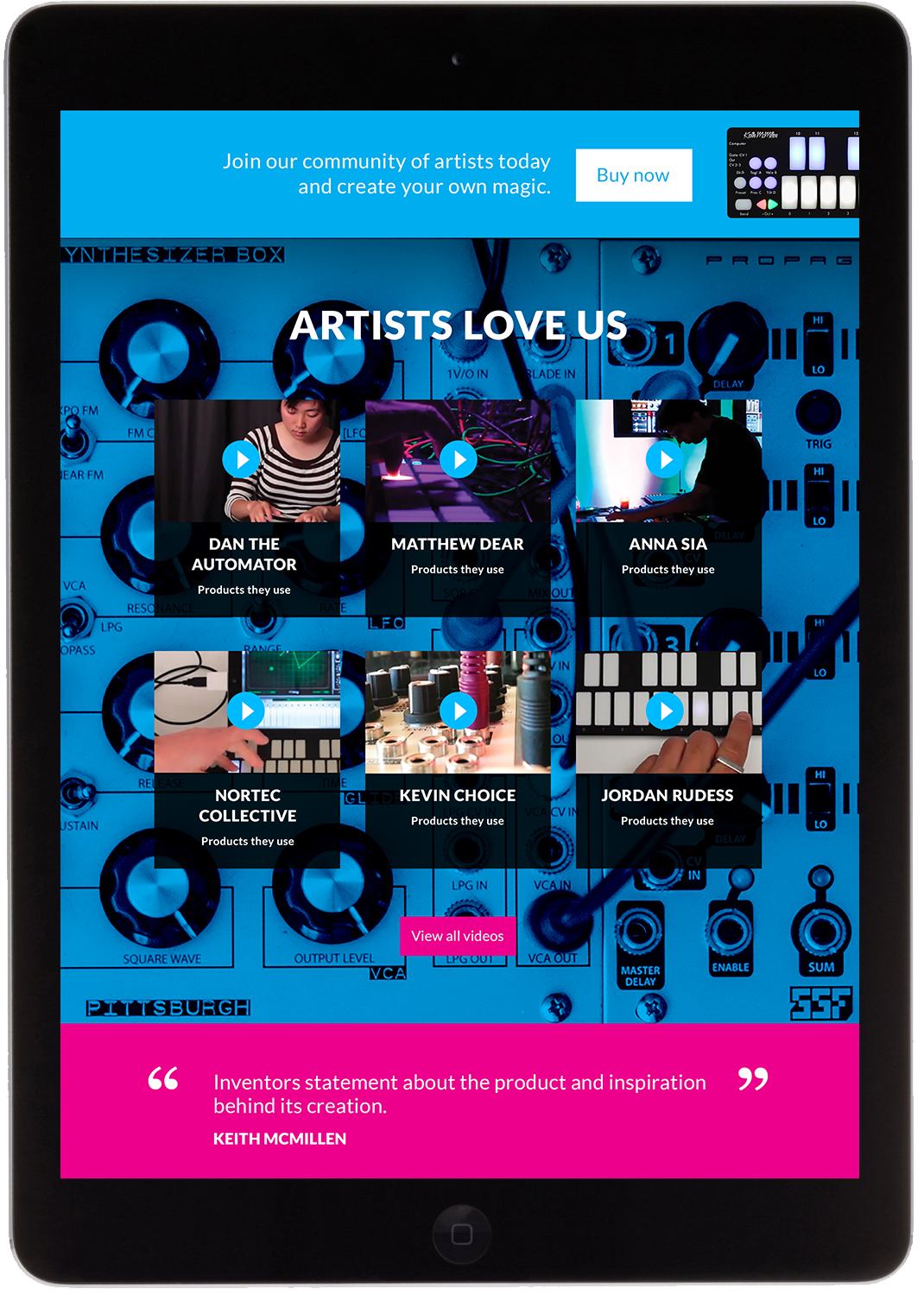 We sought to bring their instruments to life using a rich color palette, bold fonts and enticing product imagery. The result was a media-rich experience of glamorous product shots, videos, and a community space for artists to share their experiences and build upon other artist creations. We worked to ensure that the site echoed the experience of its products, making it as tactile and engaging to explore as any one of KMI's digital instruments.