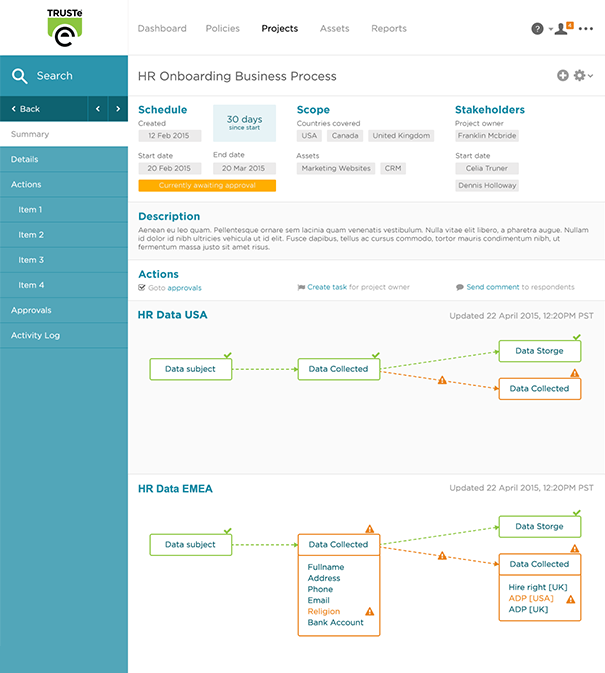 The product that we co-created with TRUSTe enables their customers' privacy teams to obtain, in a straightforward manner, detailed information about how customer data is being used and then compare these responses against global privacy regulations to determine compliance. Our workflows allow product teams to proactively address privacy standards as an integrated part of their development process rather than having to remediate issues after a product has been released.